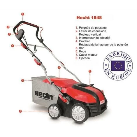 Hecht 1848 2en1 Scarificateur et ventilateur électrique gazon 1800 W Bac 55 l Largeur du travail 383 mm Hauteur +9 à 13 mm
